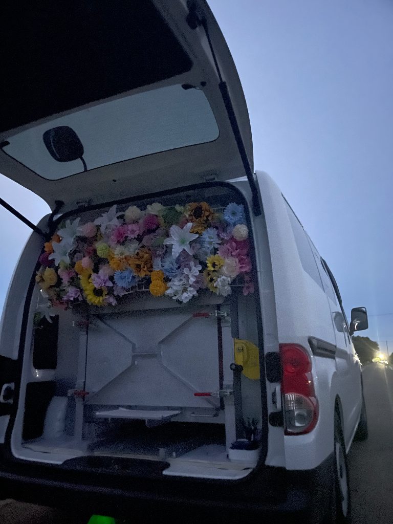 今回はご自宅の敷地内に駐車できるスペースがなかった事、道路が少し狭かった事、交通量も多かった事から火葬台ではなく助手席にお乗せしてご出棺となりました。